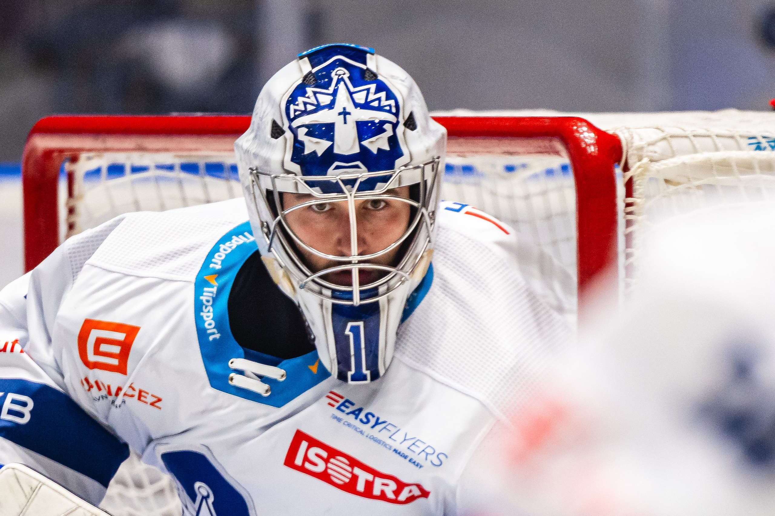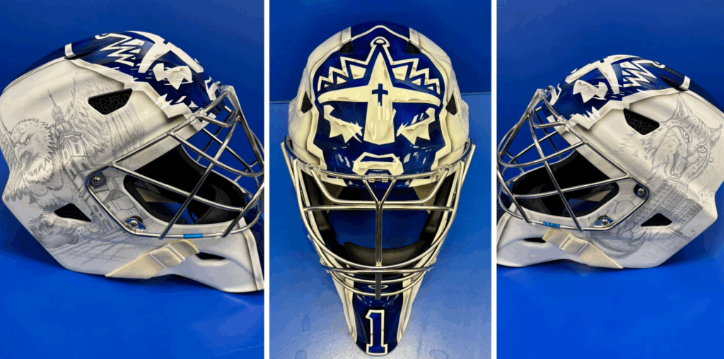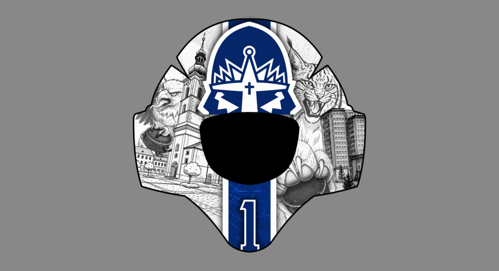 Už pátým rokem tvořím design pro masky extraligových brankářů Kladna. Gólman Adam Brízgala si zakládá na tom, že svou masku chce mít primárně bílou – jeho letošní maska tento požadavek splňuje a zároveň navazuje na dresy, ve kterých Rytíři v sezoně 2025/26 nastupují.